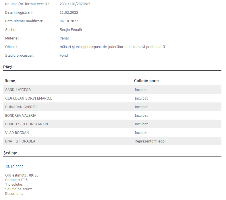La data de 11 februarie 2022, cauza era înregistrată la instanța din Oradea, dar în luna mai 2022 aceasta a admis excepţia necompetenţei teritoriale a judecătorului de cameră preliminară din cadrul Tribunalului Bihor, invocată de procurorul DNA Oradea. În această situație, a fost sesizată Înalta Curte de Casație și Justiție, în vederea soluționării conflictului negativ de competență.