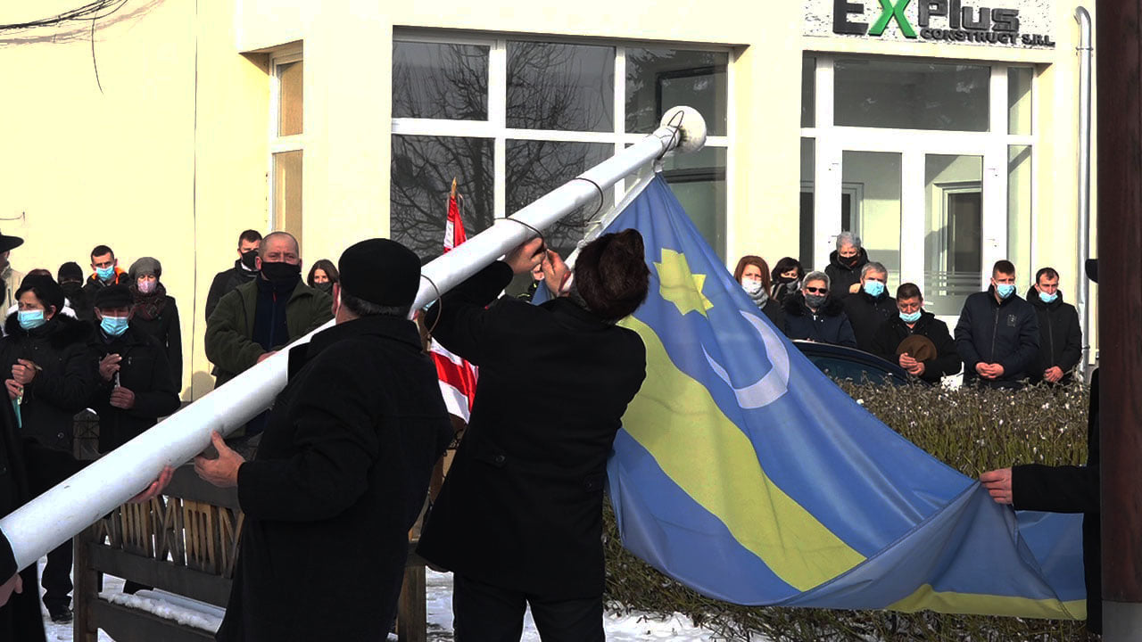 Într-un eveniment la care s-au adunat câteva persoane, care au aprins lumânări la baza stâlpilor de acum goi, ca într-un ritual de doliu, s-au ţinut cuvântări pline de venin la adresa „naţionaliştilor” români, care îndrăznesc să îi priveze de adularea unor simboluri „sfinte” pentru ei.