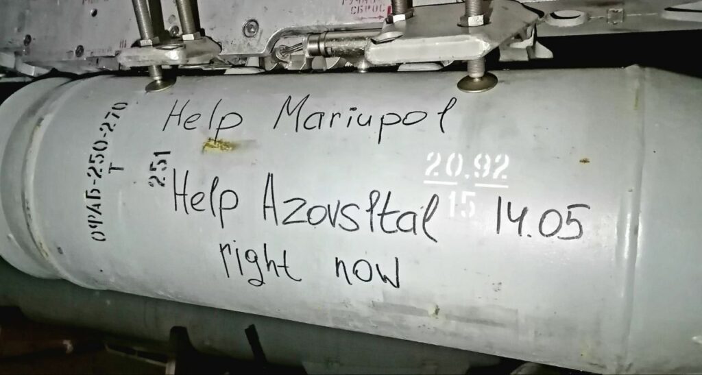 Sursa imaginilor este neclară, însă pe ceea ce se presupune că sunt bombe se poate citi în rusă „Kalush, cum ai cerut! Pentru Azovstal” şi în engleză „Ajută Mariupol – Ajută Azovstal acum”, datat 14 mai.